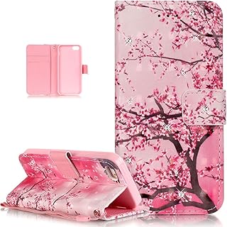 Kompatibel mit iPhone SE Hülle,iPhone 5S Hülle,iPhone 5 Hülle,Glänzend Glitzer Strass Diamant Bunte Malerei PU Lederhülle Schutzhülle Handyhülle Tasche Flip Wallet Ständer,Rosa Pflaumen Blüten Blumen