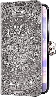 Uposao Kompatibel mit Huawei P Smart Plus 2019 Hülle Glitzer Diamant Strass Mandala Blumen Leder Hülle Flip Schutzhülle Handyhülle Brieftasche Wallet Bookstyle Case Tasche Magnet Kartenfach,Grau